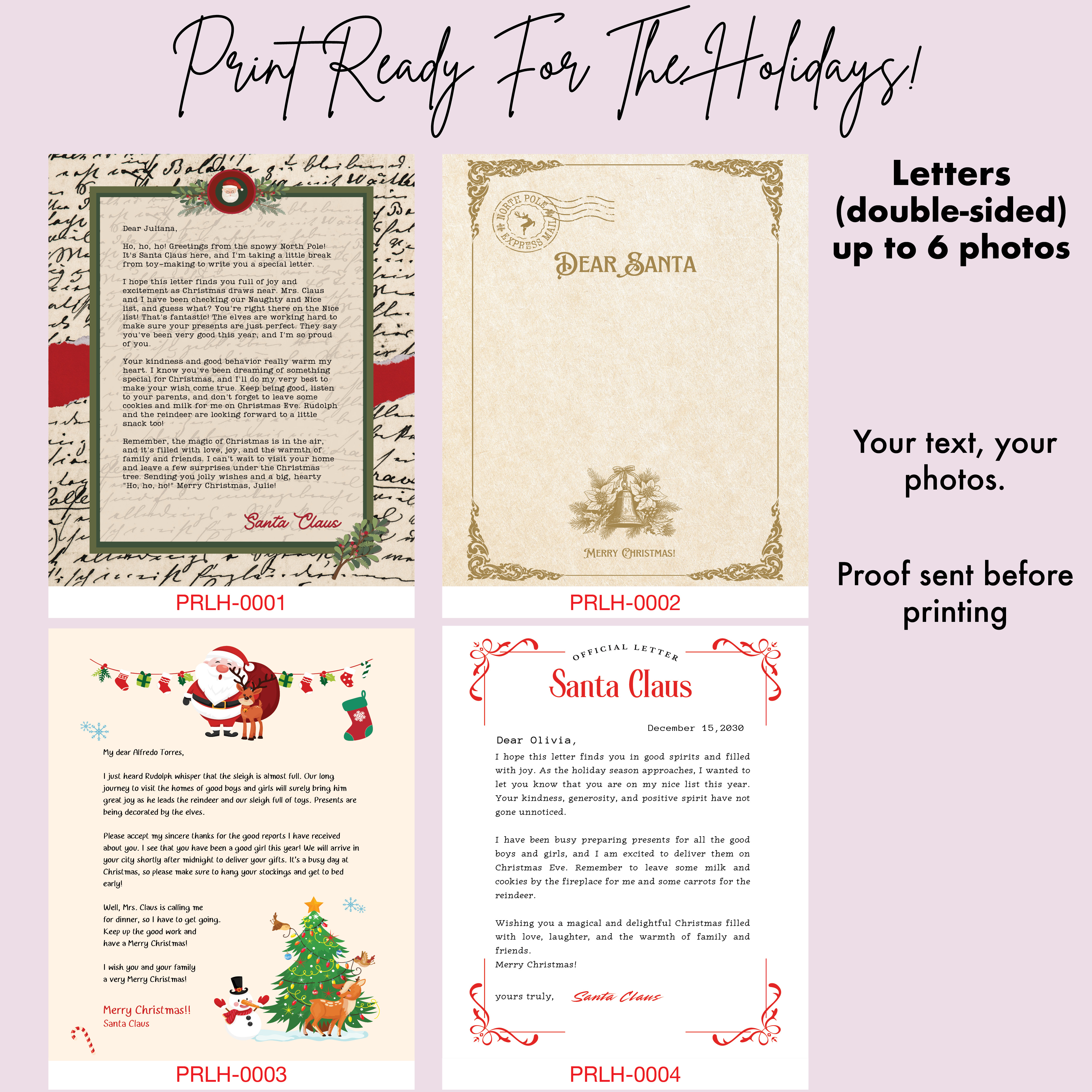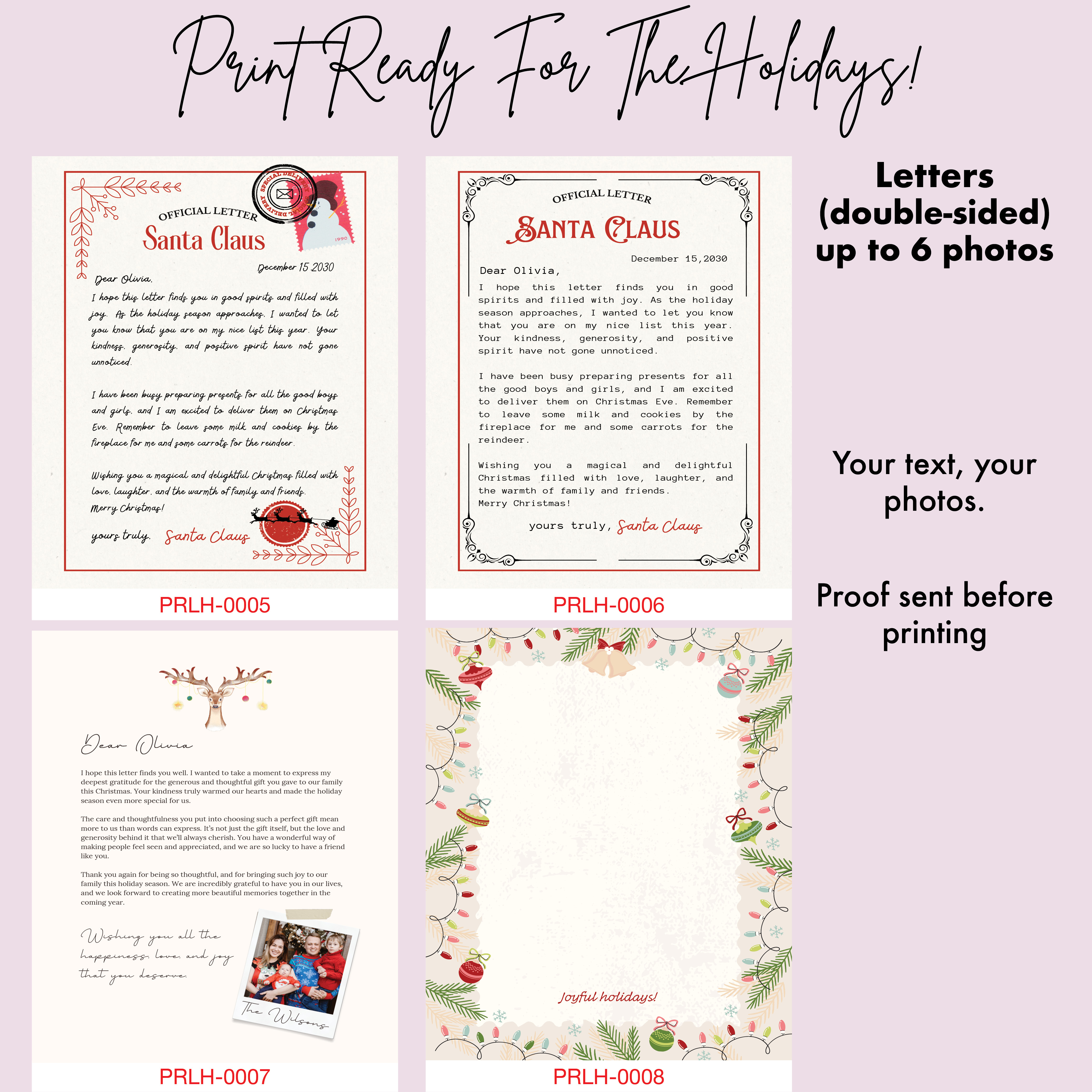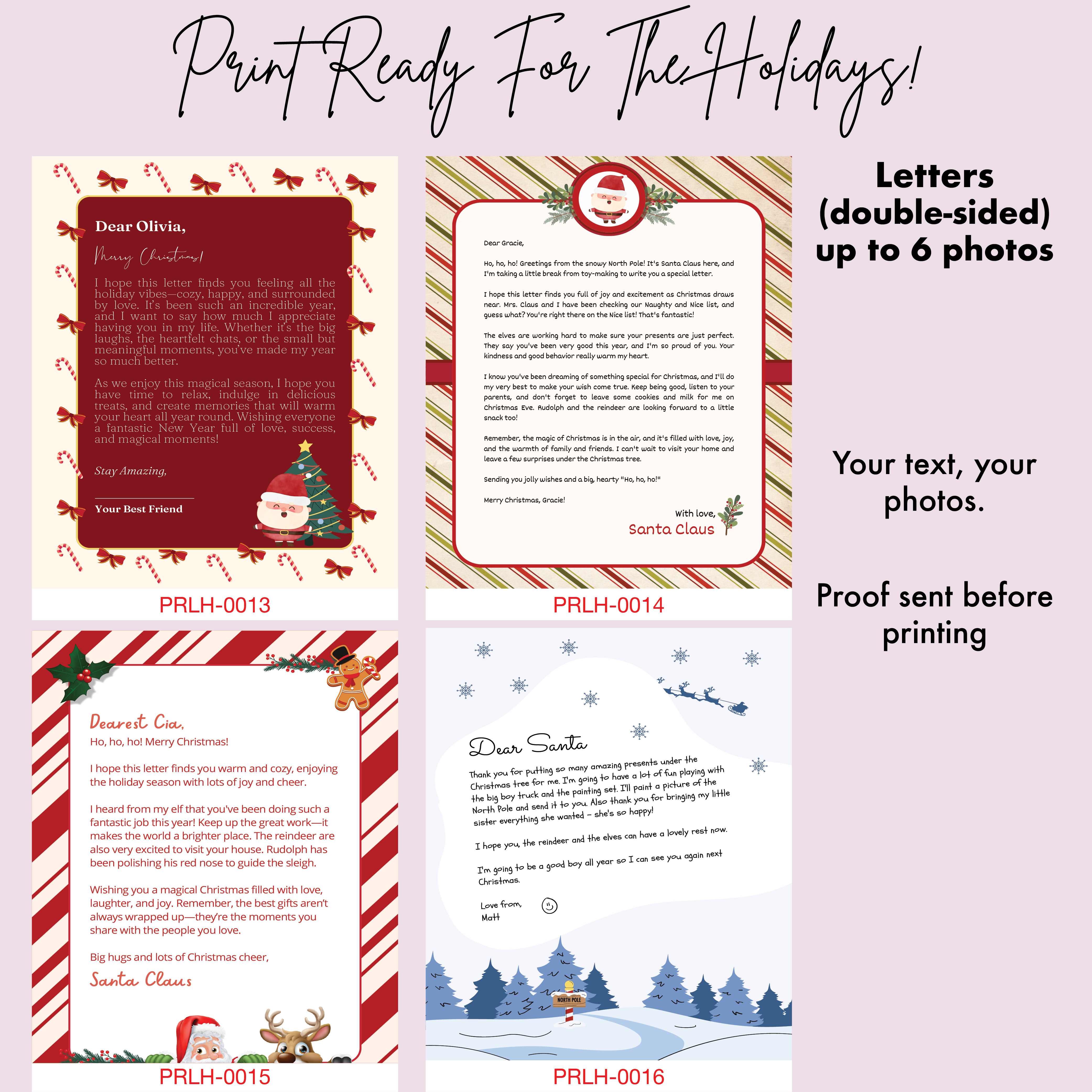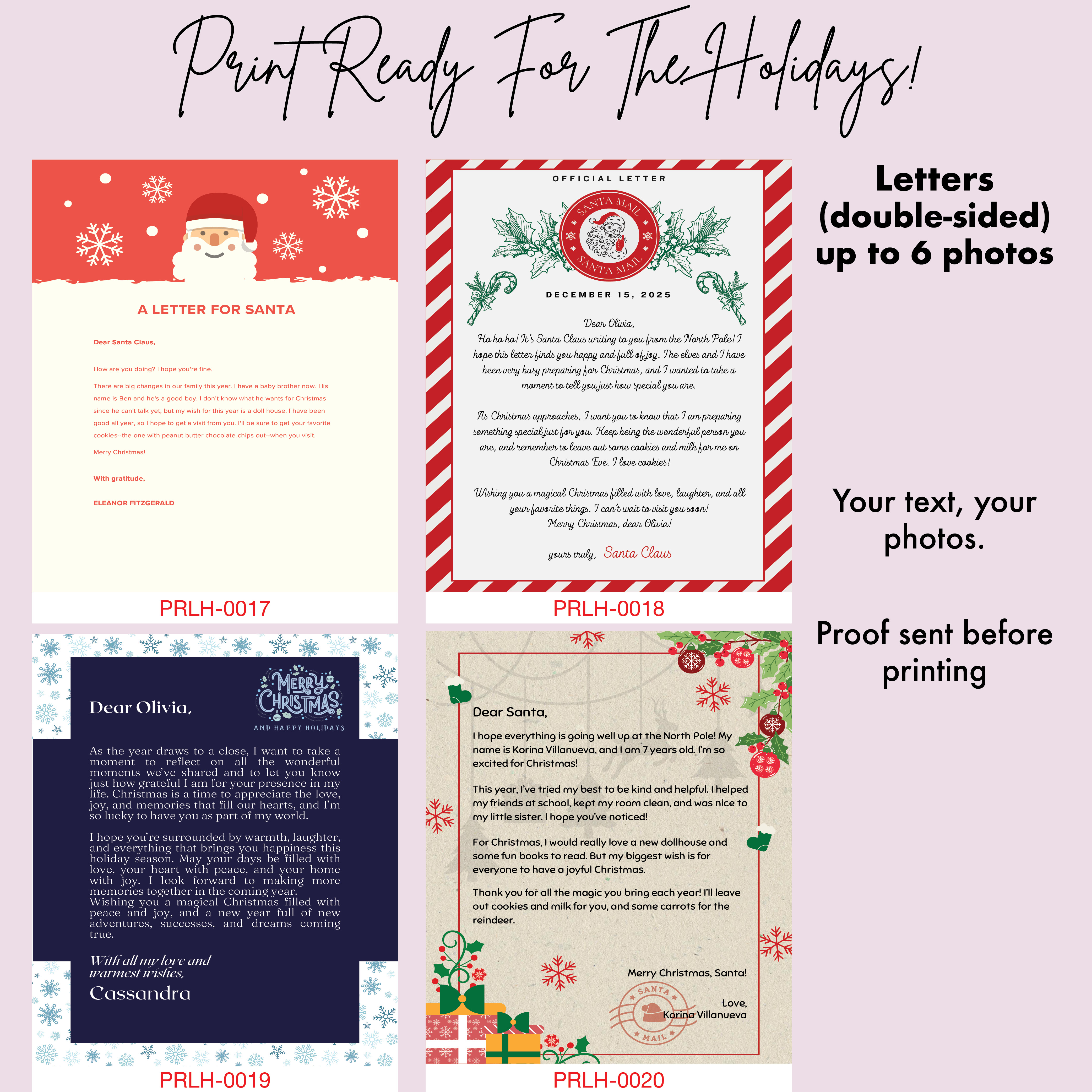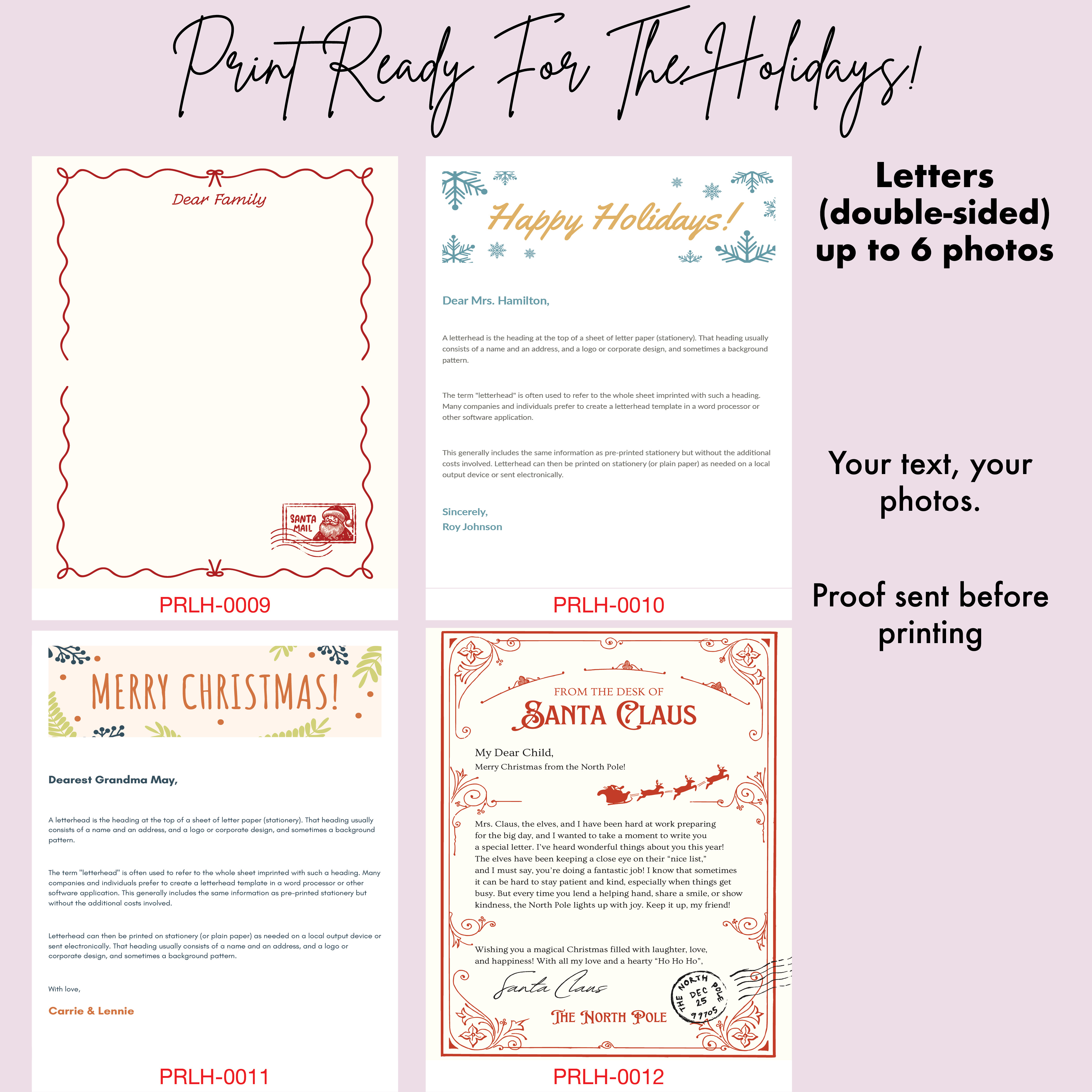 We will design and style your Christmas letter for you. Your words, your photos (up to 6 photos) our ready-to-go templates. Scroll through the samples above (click on purple scroll dots) and choose which template you'd like on the right. Place your order and email your text and photos to